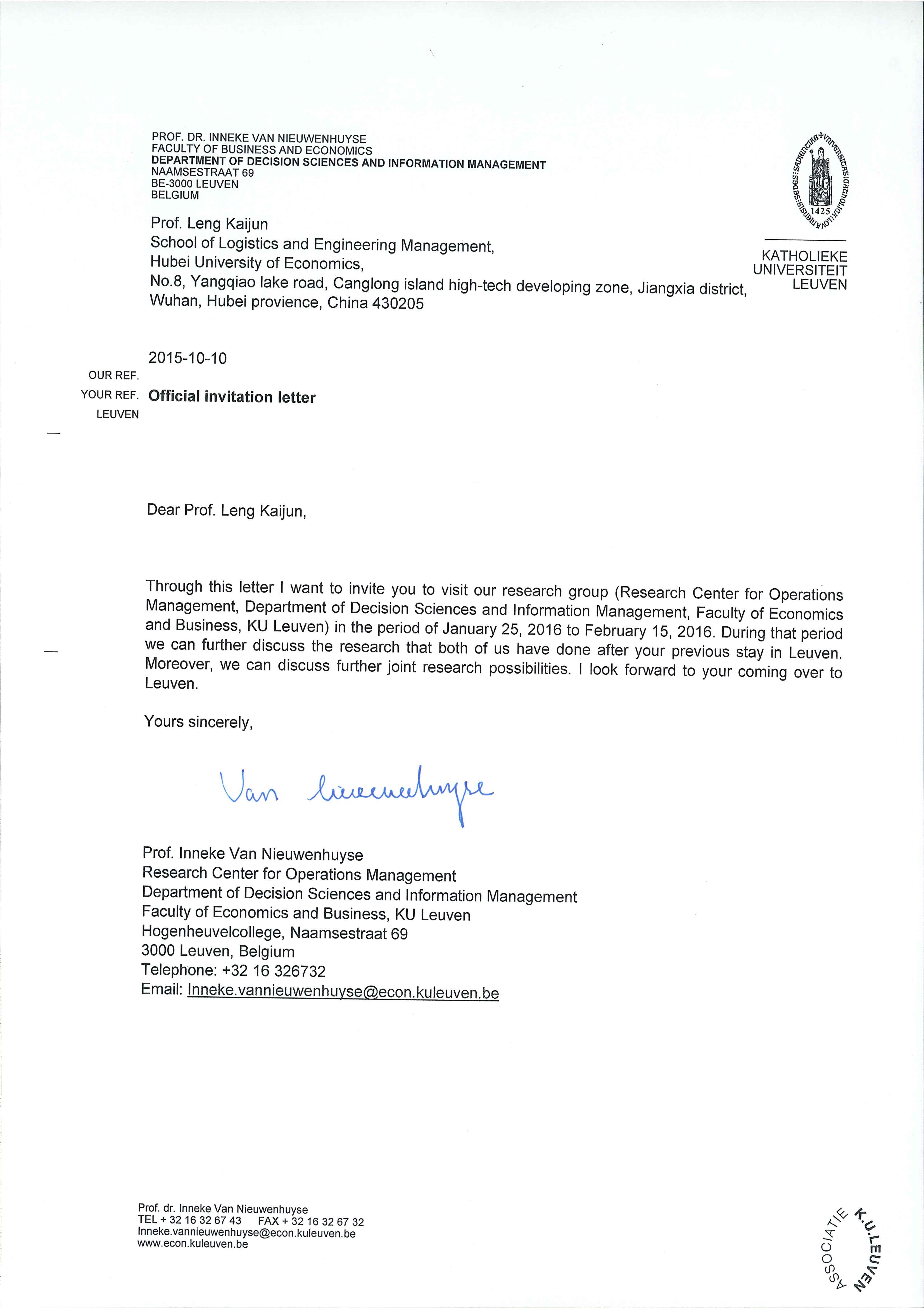 应比利时鲁汶大学邀请,我校物流与工程管理学院冷凯君副教授拟于2016年1月25日—2月15日赴比利时鲁汶大学进行课题研究,考察境外合适研究、教学人选,构建跨国学科团队。冷凯君副教授拟在比利时停留22天,所需经费由个人科研经费承担。