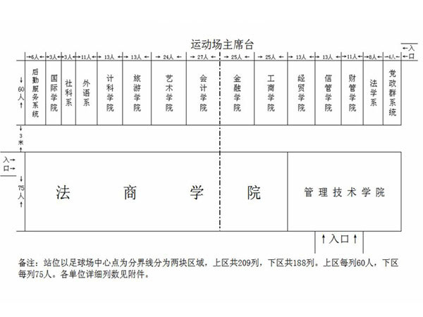 4、“党政群系统”和“后勤服务系统”人员区域在运动场两侧,部门负责人组织人员从相应入口进场,在引导牌后就位。