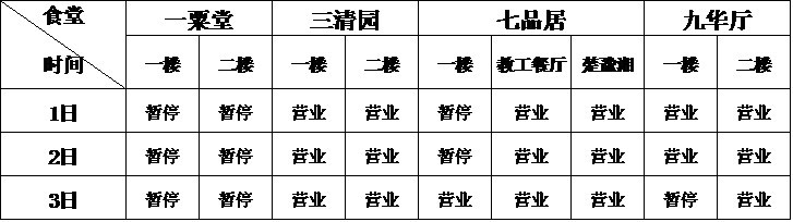 根据学校放假时间的安排,对食堂元月1日—3日的营业时间进行了调整(见下表):