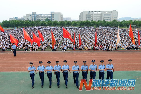 本网讯(记者 李智 吴梦 摄影 杨宏斌)9月2日,2013级新生开学典礼暨军训动员大会在西区运动场隆重举行。校领导周元武、吕忠梅、漆腊应、张奋勤、吴少新、鲁晓成、何慧刚,法商学院院长杨正才、党委书记曾海燕,空军预警学院预警装备系政委邓朗顺大校、副主任林坚上校及130位军训教官出席。大会由学工处处长张治武主持。