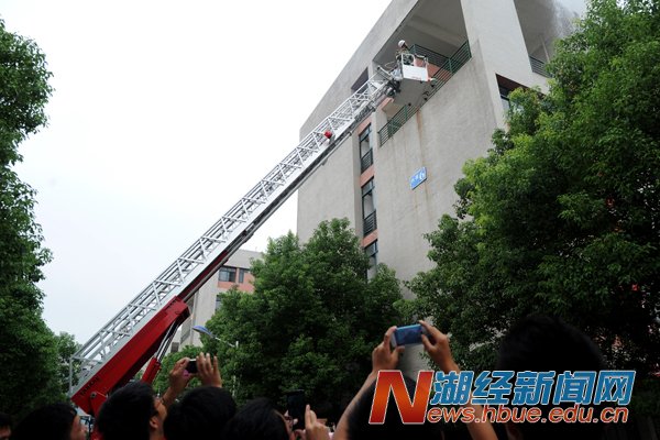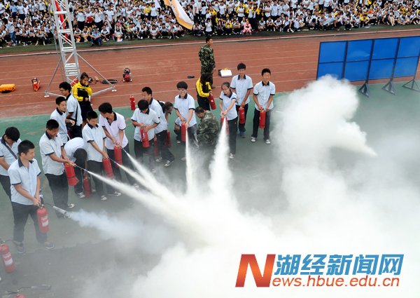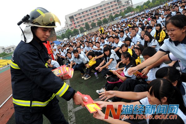 武汉市消防局东湖高新消防大队的官兵们现场发放《防灾应急手册》读本,为新生介绍了防火、救火和扑救火灾的方法,以及如何逃离火灾、保护生命等相关知识,并通过消防车喷水灭火、云梯车架梯救人和汽垫接高层楼逃生者等现场演示,指导新生正确运用消防器材灭火,教会新生逃生技能。