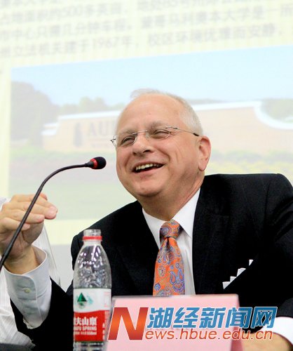 Veres校长用中文向同学和老师问好,赢得热烈掌声。他说,AUM和HBUE合作培养信息管理与信息系统本科人才,是双方经过多年的协商、合作与努力才获得的结果,两所大学对同学们充满无限期待。希望合作双方认真落实项目实施协议,为学生成长发展提供最好的条件保障,保证教育质量;希望同学们好好学习,期待三年后中美班的同学都能到奥本去学习。