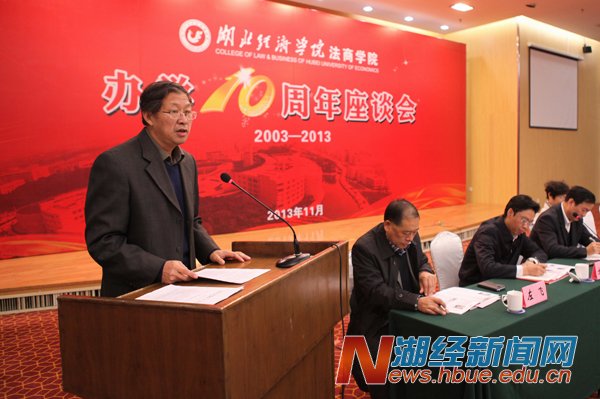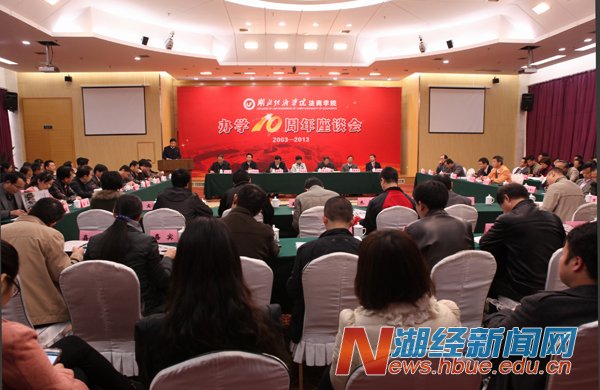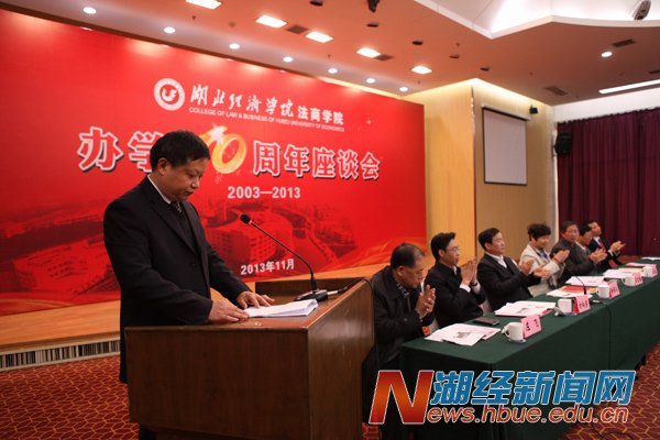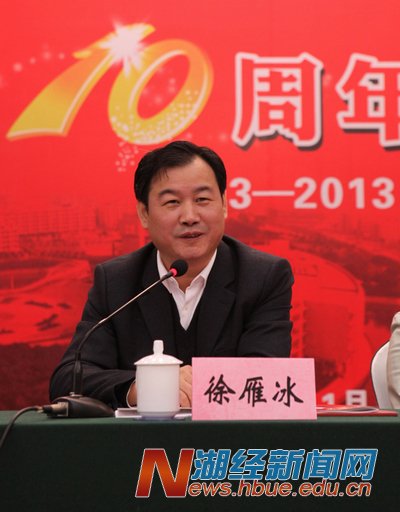 徐雁冰在讲话指出,湖北经济学院法商学院办学十年取得显著成绩:一是办学效益好。充分发挥新机制办学活力,取得良好的社会效益和经济效益,法商学院获得较快发展;二是“三率”数据好看。学生高考第一报考率高,新生报到率高,毕业生就业率好;三是教师强,充分利用举办高校优质教育资源,为培养高素质人才提供了重要保障;四是学生好用。学生毕业后在社会上适应性强;五是社会好评。法商学院的毕业生在社会有良好的口碑,社会满意度较高。徐雁冰强调,十八届三中全会提出全面深化改革目标,对高等教育提出了新的要求,希望法商学院坚持改革创新,取得更大成绩。