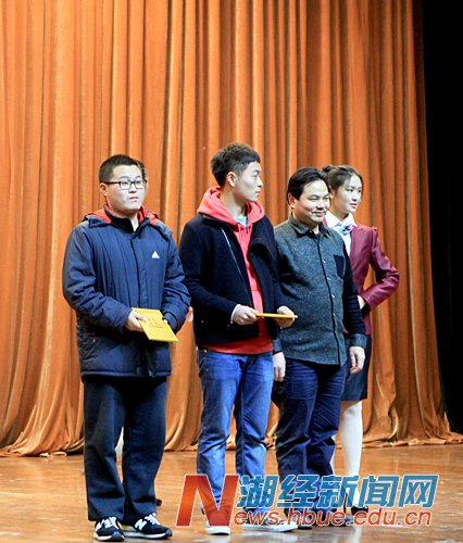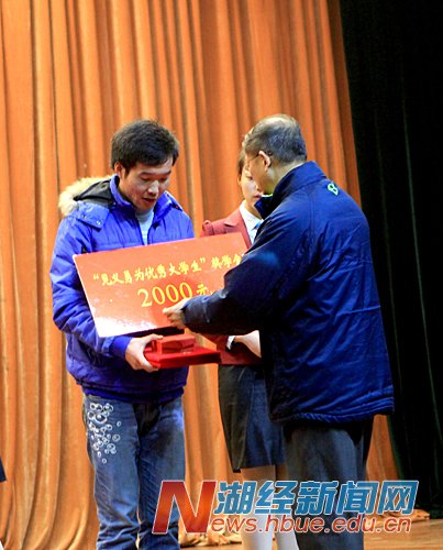 校党委书记周元武为信息管理学院电商Q1141班学生李玉伟同学颁发“见义勇为优秀大学生”奖。
