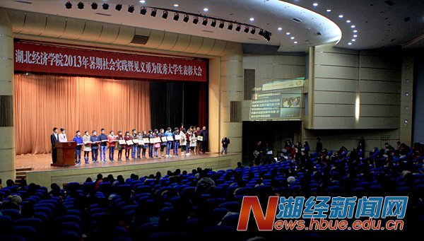 本网讯(记者 黄鹏 通讯员 彭心贝 摄影 邹冉 夏昊炜)12月19日, 2013年暑期社会实践暨见义勇为优秀大学生表彰大会在大学生活动中心隆重举行。校领导周元武、漆腊应、张奋勤、廖长林出席, 党委宣传部、教务处、学生工作处、科研处、团委等有关职能部门负责人,各院系分管学生工作的书记(副书记)、辅导员及学生代表共1500人参加了大会。