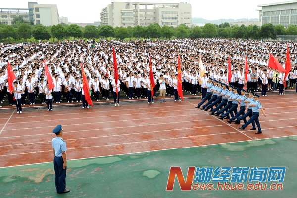 本网讯(记者 陶慧 摄影 杨宏斌)9月1日,2014级新生军训动员大会在西区运动场举行。校党委副书记张奋勤、廖长林,法商学院院长杨正才,空军预警学院陆基预警系政委邓朗顺大校、副主任谢树军中校、军训团团长赵永帅少校出席,7000余名新生参加动员大会。校人武部副部长董诚主持。