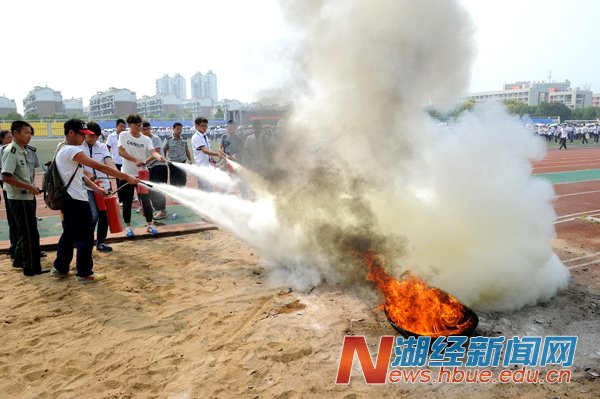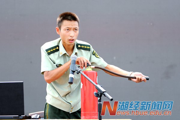 江胜东给新生支招,列举实例告诫同学们如何预防诈骗、盗窃、抢劫。罗振兴讲解了火灾形成的原因、类型以及火场逃生的方法,并演示灭火器的正确使用方法。讲座后,消防官兵进行了现场灭火演练。