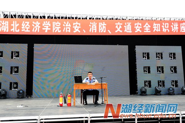本网讯(记者 陶慧 摄影 杨宏斌)为了普及安全知识,强化安全意识,增强防火、防盗、防骗能力,9月5日,学校在西区运动场举行2014级新生治安、消防安全知识讲座。武汉市公安局江夏分局藏龙岛派出所教导员汪胜东、武汉市公安消防局江夏消防大队罗振兴上尉分别就治安和消防安全知识向同学们进行讲解。7000余名新生聆听了讲座。