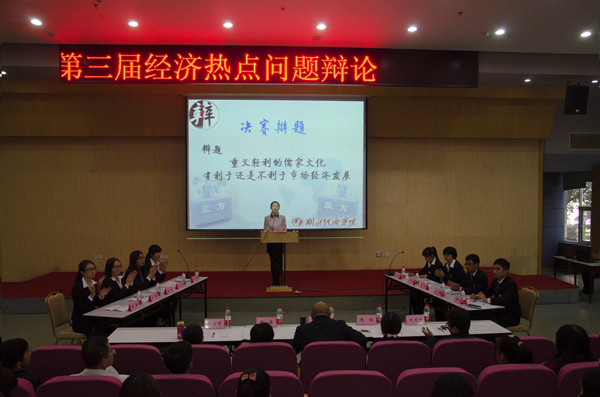 决赛中,中南民族大学代表队、中南财经政法大学代表队围绕“重义轻利的儒家文化有利于还是不利于市场经济发展”的辩题展开辩论。最终,中南民族大学获得冠军,中南财经政法大学获得亚军,湖北经济学院经济学系“经辩队”和天问辩论队获得季军。中南财经政法大学代表队三辩何乔柏荣获决赛“最佳辩手”称号,我校杜欢欢等14名同学在校内选拔赛中获最佳辩手称号。