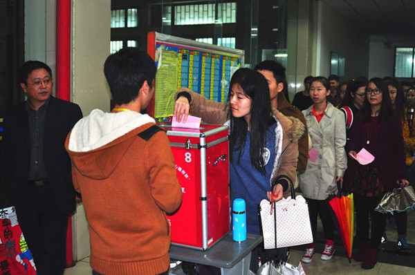 本网讯(特约记者 李丹丹 祁君 摄影 黄文韬 夏昊炜)11月23日晚,从1-4号教学楼、大学生活动中心到法商综合楼,19122名学生冒雨前往六个投票点为自己心中的自强之星投出神圣的一票,参与投票人数占全校学生人数的71.7%,同学们以真实意愿直接行使了自己的民主权利。24日中午,在大学生事务中心,各院系学生会主席和团委副书记共40人作为学生评委,分别作为院系代表,为理想的自强之星候选人投票。校党委副书记、纪委书记廖长林,学生工作处处长张治武率学工处工作人员深入投票现场,全程督查现场投票工作。