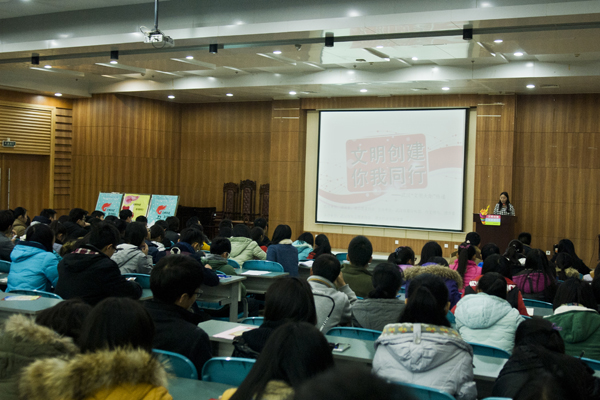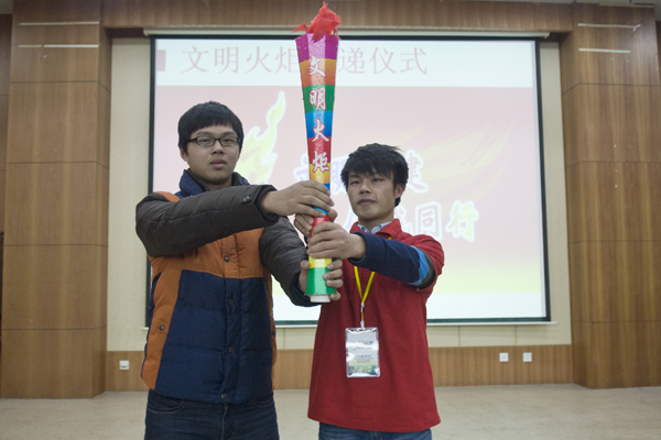 本网讯(通讯员 宋端阳 吕漪 周隽 摄影 陶慧 史声宇 李子悦)12月11日晚,以“文明创建,你我同行”为主题的武汉市“文明火炬”高校传递仪式在图书馆报告厅举行。团市委学校与志愿者工作部部长周洁、校党委宣传部部长张以林、校团委副书记王友刚等出席仪式。