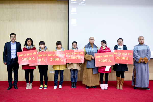 张澍、灯磬法师、心一法师为贫困学生颁发助学金