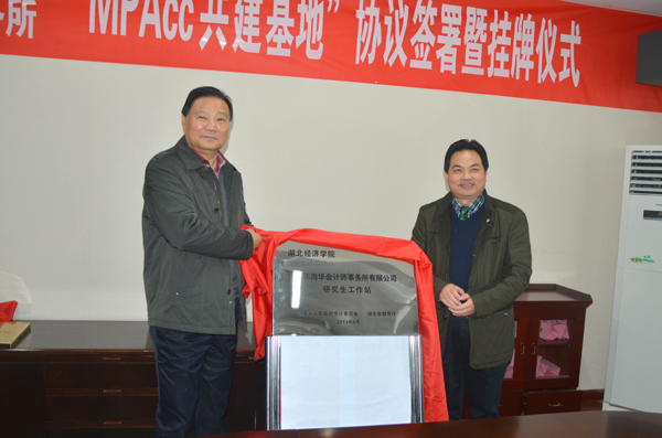本网讯(特约记者 黄益雄 郭恒亮)12月16日,“众环海华会计师事务所有限公司研究生工作站”和“湖北经济学院MPAcc研究生实习基地”揭牌与签约仪式在众环海华会计师事务所举行。众环海华会计师事务所董事长兼管理委员会主任黄光松、总经理兼首席合伙人石文先、高级合伙人兼副总经理雷闻和王玉伟,副校长陈向军,研究生处、MPAcc中心和会计学院负责人出席。