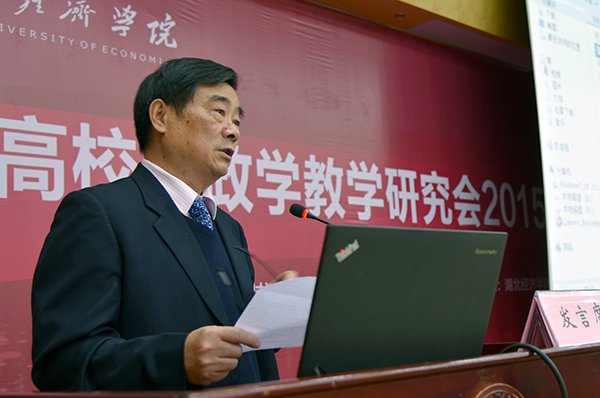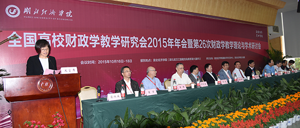 副校长漆腊应教授在开幕式上致辞。他介绍了湖北经济学院的办学历程,从办学条件、师资结构、生源质量和人才培养以及科学研究等方面总结了我校的办学成果,并阐述了我校今后内涵式发展思路。他同时介绍了我校财政学科的发展历程、教学科研成就以及社会影响力。