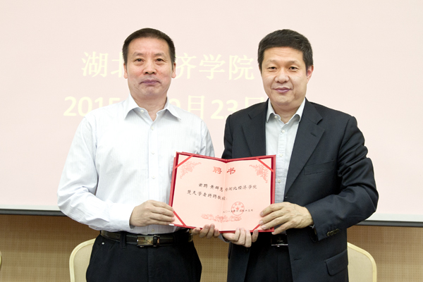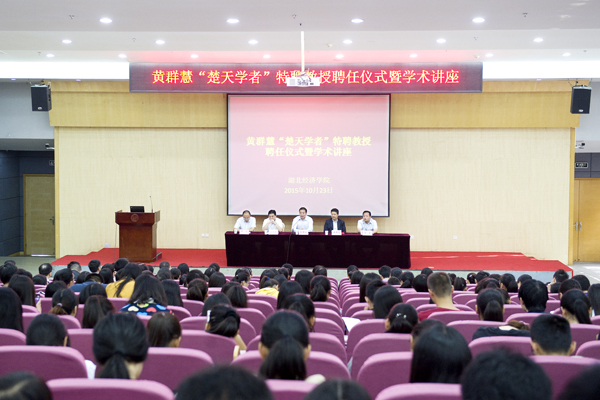本网讯(通讯员 刘望辉 摄影 陶慧)10月23日,学校举行“楚天学者特聘教授”聘任仪式,副校长漆腊应教授代表学校为著名经济学家、中国社会科学院工业经济研究所所长黄群慧教授颁发聘书。经济学系、人事处负责人以及各院系师生代表400余人参加仪式。副校长陈向军主持。
