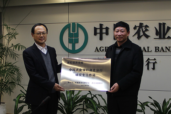 本网讯(特约记者 肖家杰)11月24日,我校又一省级“研究生工作站”在中国农业银行湖北省分行正式挂牌成立。副校长鲁晓成、农行湖北省分行副行长刘永生共同为“研究生工作站”挂牌。