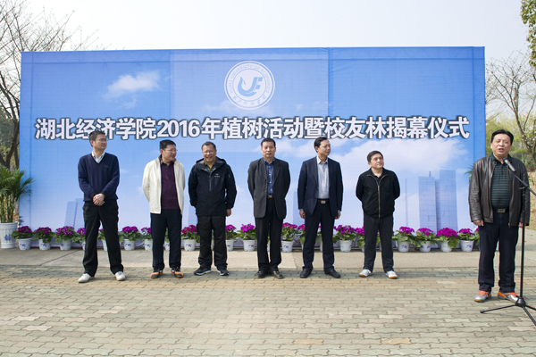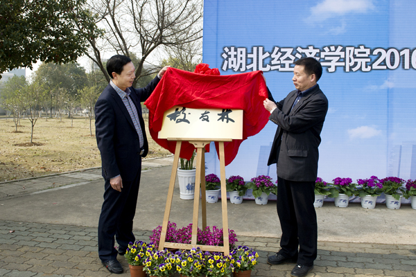 漆腊应和徐风为“湖北经济学院校友林”揭牌。