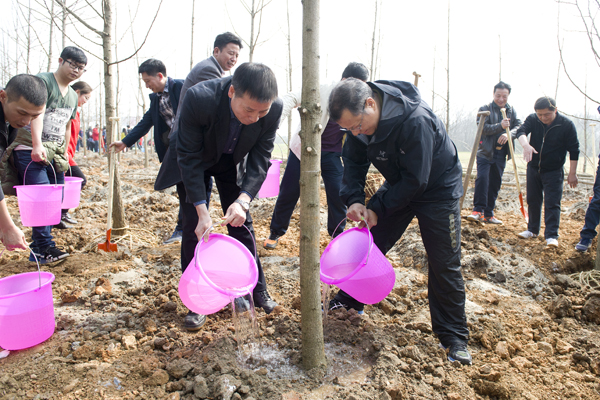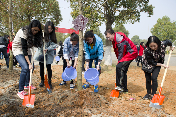 本网讯(见习记者 饶婷 吴敏慧 摄影 陶慧 常旖晖)3月19日,我校2016年植树活动暨校友林揭幕仪式在东区举行。校党委书记温兴生,校长、校友会会长漆腊应,副校长吴显富,副校长、校友会副会长何慧刚,招商银行武汉分行副行长谈继彬校友,武汉锐风置业有限公司董事长徐风校友出席,校友会常务理事成员,各院系、部门的教职工及学生代表,校友代表以及招行武汉分行的新入职员工等300余人共同参加。党委常委、校友会副会长张以林主持。