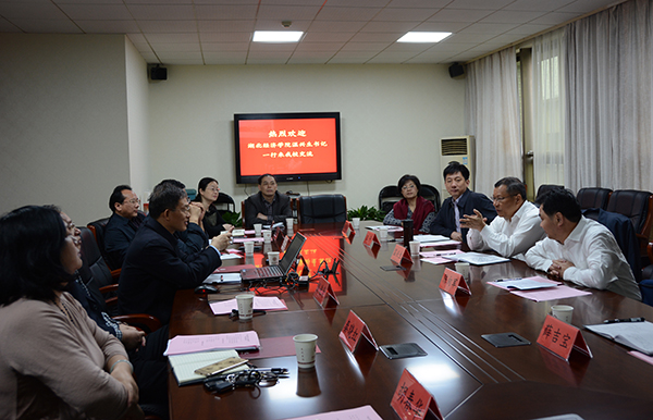 在湖南商学院,该校党委书记唐亚阳详细介绍了学校办学定位、特色和发展战略,教学、科研和人事制度改革的思路与成效。近两年,该校确立了“三升三旺”发展目标和愿景(升一本、升大学、升博士点,人才旺、人气旺、事业旺),凝聚了发展共识,提振了精气神。深化教学改革,推动人才培养由传统型向创新创业高级应用型人才转变,取得良好效果。强力推动科研发展,创新机制、激发活力,创造了连续保持全国高校国家社科基金项目数“百强校”的奇迹。温兴生对此表示出极大兴趣,从发展思路、工作机制、实施策略等不同角度,深入地挖掘、学习了他们的经验。两位党委书记一致同意,湖北经济学院和湖南商学院建立战略合作关系,并就双方合作内容、工作机制等事宜进行了初步商讨。湖南商学院院长陈晓红与温书记见面,党委副书记夏继春、副校长彭进清及党政办、发规处、人事处、教务处负责人参加了交流研讨。