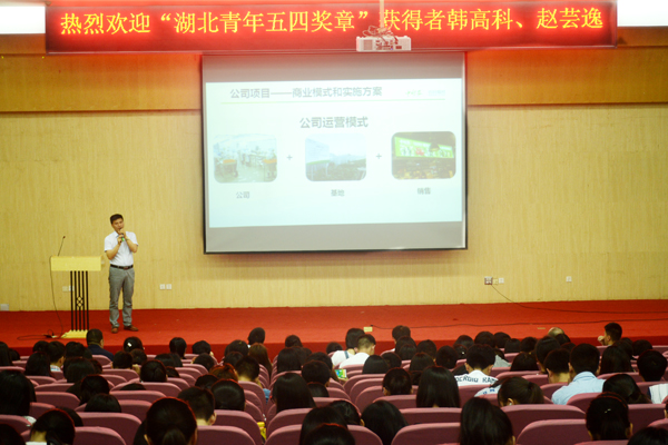 本网讯(记者 黄天福 见习记者 梅莹莹 通讯员 程慧明 摄影 江星辰)5月12日,由校团委主办、校友会承办的“身边人的创业与公益”分享会在大学生活动中心举行。2016年“湖北青年五四奖章”获得者韩高科、赵芸逸担任主讲嘉宾。校团委、校友会负责人和学生代表近500人参加。
