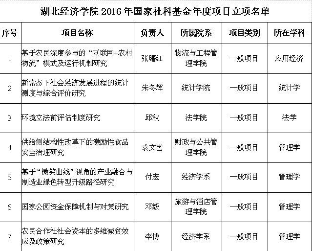 本网讯 近日,2016年国家社科基金年度项目立项结果公布,我校7项课题获准立项国家社科基金一般项目,立项率达到17.1%,高于全国平均立项率14%,立项数在省属高校中位居第三,管理学学科立项数在全国高校范围内位居第四,创我校历史新高。