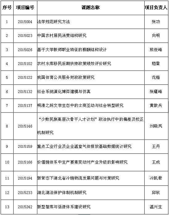本网讯 日前,湖北省社科规划办公布了2015年度湖北省社科基金一般项目立项名单,我校共有13项课题获批立项。