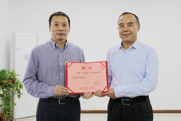 本网讯 10月13日,学校举行曾宪初特聘教授聘任仪式,校长漆腊应为曾宪初颁发聘书。人事处相关负责人、经济与环境资源学院(低碳学院)全体老师参加聘任仪式。