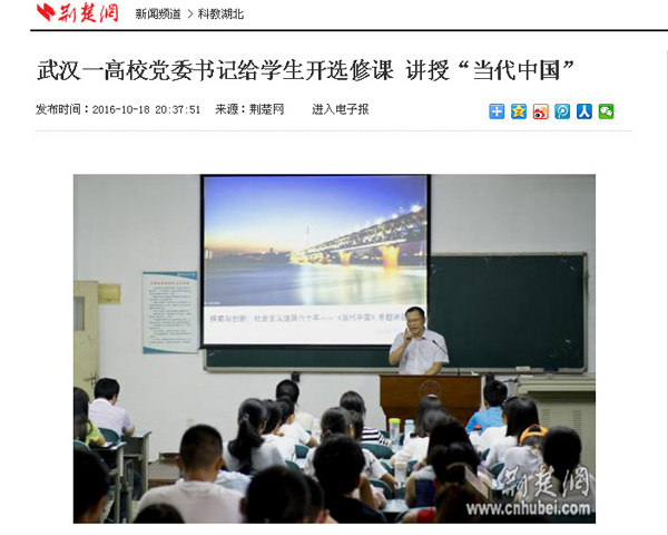 本网讯 10月18日,荆楚网以《武汉一高校党委书记给学生开选修课 讲授“当代中国”》为题报道了校党委书记温兴生为学生上课。