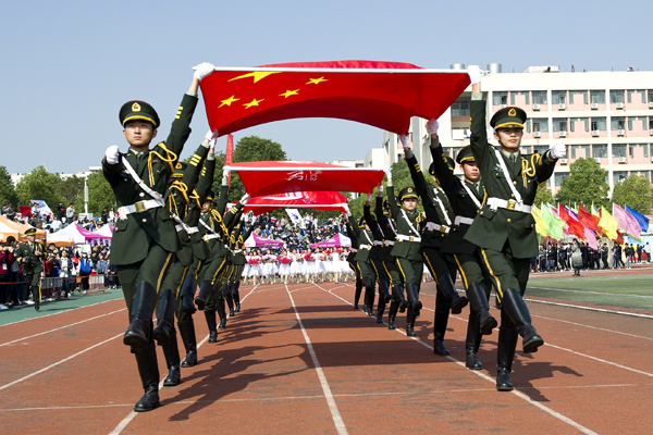伴随着义勇军进行曲,国旗冉冉升起,校旗和第十三届体育运动会会旗随后缓缓升起。