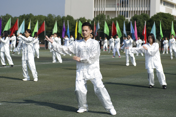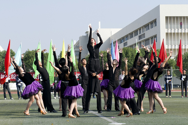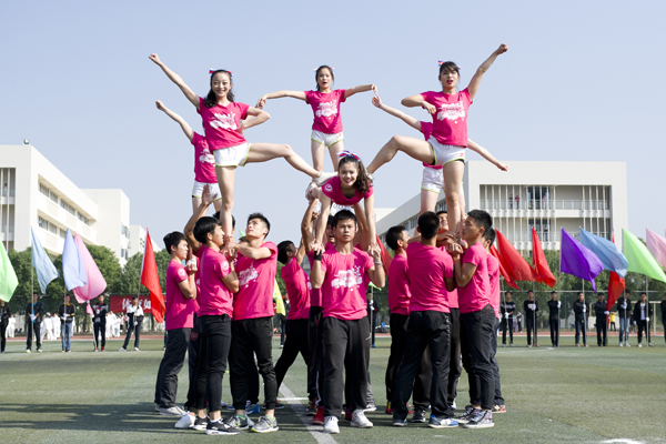 节目表演精彩纷呈。体育舞蹈活力四射,激情洋溢;太极方阵表演优雅和谐、场面壮观;啦啦操表演中,表演者高难度的高空抛接动作引起现场观众的欢呼与尖叫,将开幕式气氛推向高潮。
