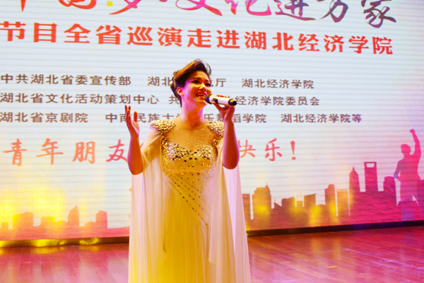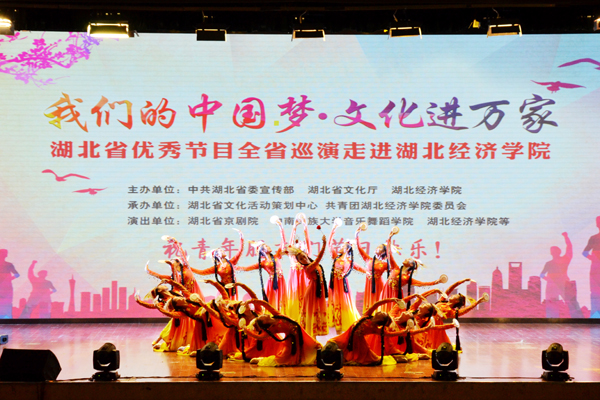 本网讯(记者 杨修杰 杨思琪 通讯员 朱嘉文 摄影 胡雪瑶 王赫兰)5月4日,“我们的中国梦·文化进万家”湖北省优秀节目全省巡演走进我校。本次活动由中共湖北省委宣传部、湖北省文化厅、湖北经济学院主办,湖北省文化活动策划中心、共青团湖北经济学院委员会承办,活动邀请了来自湖北省京剧院、中南民族大学音乐舞蹈学院和我校的优秀表演者们,为观众献上了精彩的文艺汇演。校党委书记温兴生、党委常委张以林,湖北省文化策划中心党委书记李华山与师生代表共同观看演出。