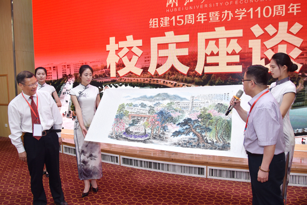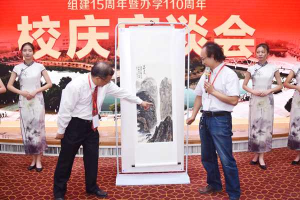 座谈会期间,台湾亚洲大学邓成连教授为校庆献上墨宝。台湾籍教师代表、艺术设计学院周明聪副教授献上一幅题为《根深叶茂、桃李芬芳》经院景观画。1986届毕业生、宜昌市美术家协会会员杨少军也为母校献上了一副三峡景观画,此为他为母校创作的十幅作品其中一幅。