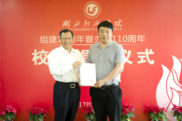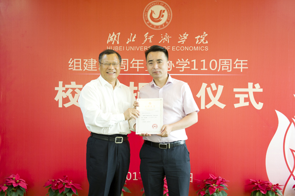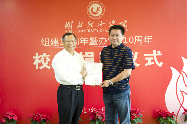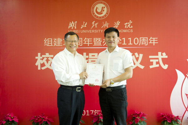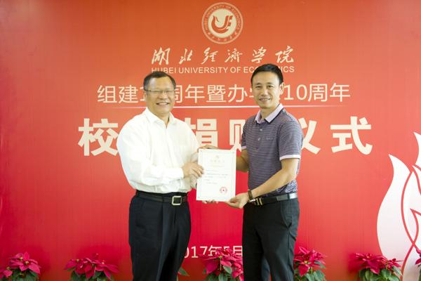 温兴生为校友们颁发捐赠证书并合影,吴显富与校友签署《湖北经济学院捐赠协议书》。