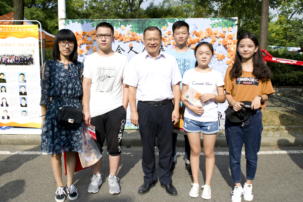 在会计学院新生入学纪念照片拍摄处,温兴生与大一新生合影留念。审计Q1741班吴旭华说:“来大学的第一天能和党委书记合影,我真的很幸运,一定会把照片好好保存。”
