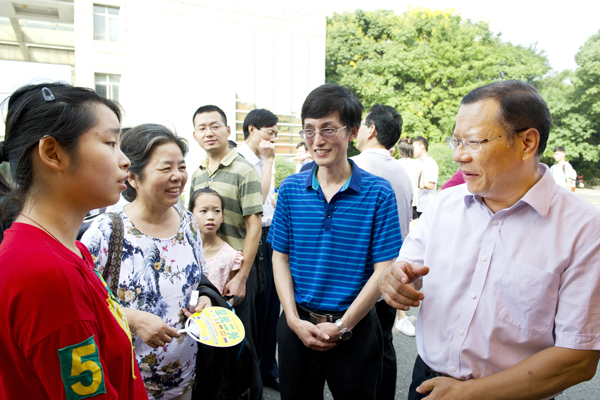 在旅游与酒店管理学院迎新接待处,温兴生向新生家长了解报到情况后说:“学校环境优美,学生学习和生活条件好,老师们教书育人认真负责,放心吧,孩子会在经院不断成长。”