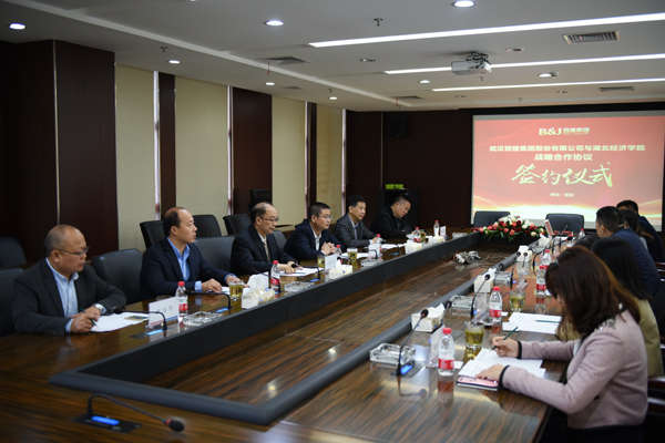 本网讯 10月11日上午,学校与武汉百捷集团股份有限公司战略合作协议签字仪式在百捷大厦董事会会议室举行。副校长何慧刚、武汉百捷集团副总裁徐新国出席并致辞。百捷集团代表,我校教务处、合作发展处、信息管理与统计学院代表出席签约仪式。