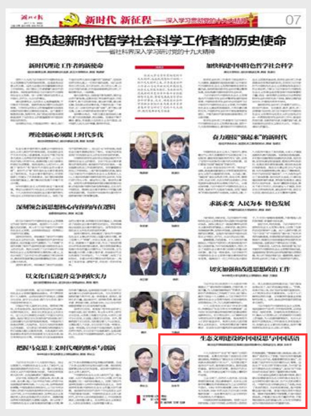 本网讯 近日,湖北省社会科学界联合会组织省内著名专家学者集中学习研讨了党的十九大精神,湖北省委常委、宣传部部长王艳玲主持。我校碳排放权交易协同创新中心孙永平博士应邀参加,并作题为“十九大报告关于生态文明建设的时代依据——中国反思与中国话语”的重点发言。此外,陶德麟、赵凌云、张忠家、邹德文、肖卫康、姚莉、顾杰、万美容、黄长义等9位社科界专家学者也作了重点发言,全省社科界70多位专家学者出席本次座谈会。11月10日,《湖北日报》第七版刊发了发言摘要。
