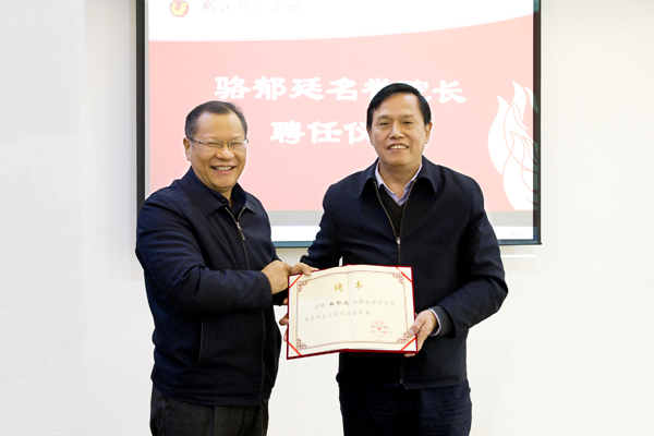 本网讯 11月23日,学校举行骆郁廷马克思主义学院名誉院长聘任仪式。校党委书记温兴生与骆郁廷签订合同并颁发聘书。副校长陈向军主持,党委常委张以林、学校相关职能部门负责人、马克思主义学院全体教师参加。