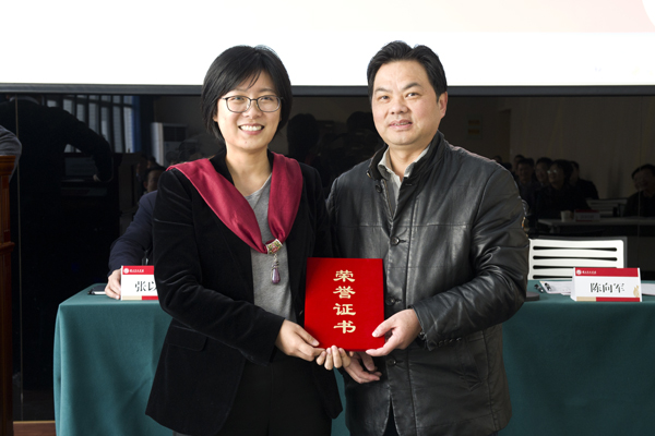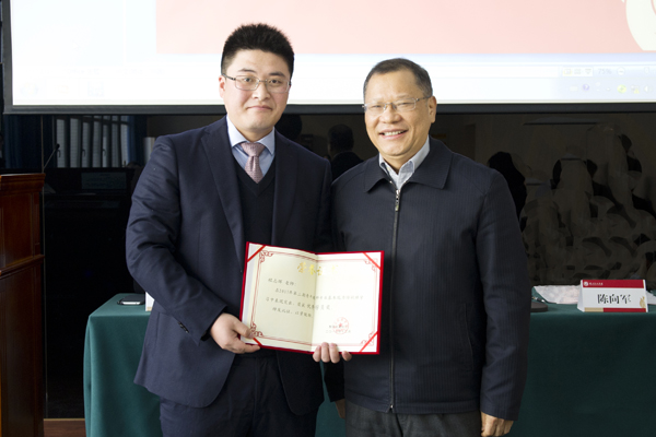陈向军为教学演练比赛第一名获得者法学院周璇博士颁发证书
