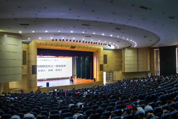 公开课由两部分组成,谭绍江博士带领同学们共同品读了《大学》一书,勉励新时代大学生要“格物、致知、诚意、正心、修身、齐家、治国、平天下”,强调“大学之道,在明明德,在亲民,在止于至善”。全国道德模范董明通过一段视频介绍了她面对困难、战胜病痛、热心公益、体味幸福的感人事迹。她以亲身经历告诉大家“什么是幸福”,强调“人生的价值和意义,不在于得到而在于付出”。董明的坚毅、勇敢和奉献精神深深感动在场的同学,被同学们接受和认可。