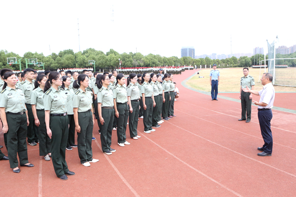 温兴生等人观看了学生军训,对新生的精神状态、训练效果表示赞赏。温兴生对担任军训指导员的全体新生辅导员提出要求,辅导员作为教育学生、管理学生、服务学生的一线直接责任人,对学生成长成才具有非常重要作用。必须加强辅导员队伍建设,提升专业素质,要借军训同新生一同锻炼的时机,增强国防意识,锤炼意志品质,培育纪律作风。他指出,培养“三有三实”人才,弘扬“厚德博学、经世济民”校训,要突出“人格化”,辅导员应成为先锋,为培养“三有三实”人才作出更大贡献。