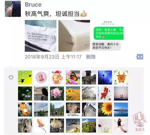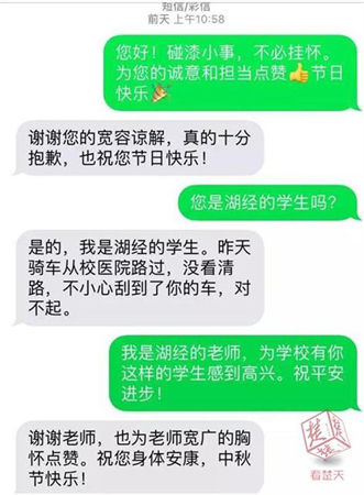 黎明星决定不追究维修赔偿问题,却担心留纸条的人会记挂此事。9月23日,他给纸条上的手机号码发了短信:“您好,碰漆小事,不必挂怀。为您的诚意和担当点赞,节日快乐!”也很快收到了回信:“谢谢您的宽容理解,真的十分抱歉,也祝您节日快乐!”短信交谈中,黎明星得知对方是湖北经济学院的学生,在为对方体现出的讲诚信、勇于承认错误、承担责任的可贵品质感动之余,将此事发到了朋友圈里。“我很少发朋友圈,这条有感而发的消息收获了最多的点赞。”