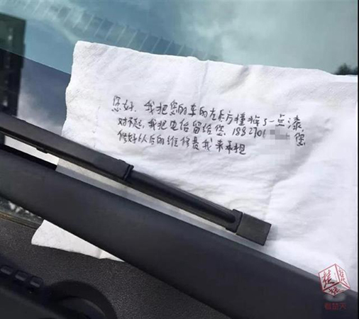 “刚开始我以为是个垃圾,后来发现纸上有字,就觉得可能不一般。”黎明星取下了纸条,只见上面写着:“您好,我把您的车左后方撞掉一点漆,对不起。我把电话留给您,您修好后的维修费我来承担。”这令他感觉很意外:“私家车在外面经常会遭遇小刮小蹭,基本上找不到是谁干的,没想到还有人主动留纸条。我看到纸条之后很感动,被这种勇于担当的精神深深触动。”