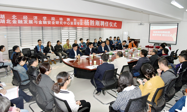 本网讯 10月18日,学校举行杨胜刚特聘教授、湖北金融发展与金融安全研究中心首席专家聘任仪式。校党委书记温兴生出席。校长董仕节与杨胜刚教授签订聘任合同并颁发聘书。学校办公室、教务处、人事处、科研处、研究生处、金融学院负责人和金融学院教师代表参加。聘任仪式由党委副书记刘大洪主持。