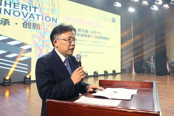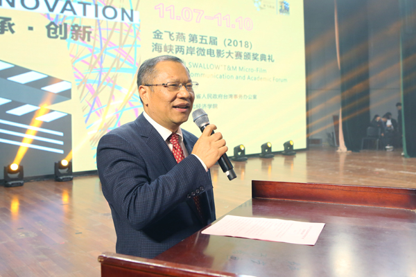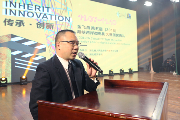 本网讯 11月9日晚,“金飞燕”第五届海峡两岸微电影大赛颁奖典礼在我校举办。湖北省政协副主席秦顺全、国台办新闻局张柏、湖北省台办主任李建红、台湾联合报股份有限公司总经理杨大德,校党委书记温兴生、校长董仕节、党委副书记刘大洪、副校长何慧刚、党委常委张以林出席。秦顺全、温兴生、杨大德现场致辞。我校参赛作品《寝室公约》获“铜飞燕奖”。