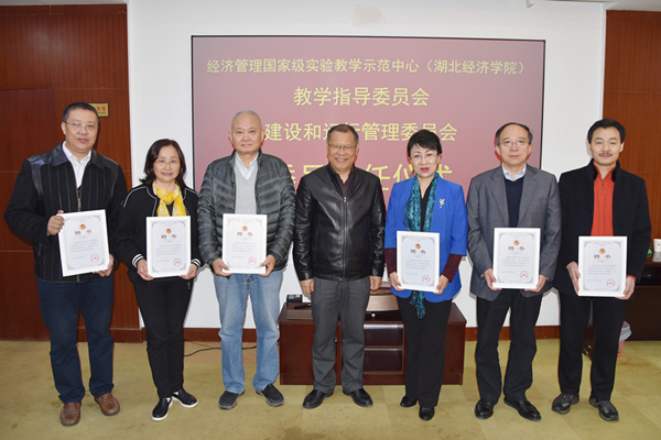 温兴生为哈尔滨商业大学张莉、武汉大学尤赤矶、安徽大学张洪、山东财经大学丛建阁、重庆工商大学饶光明、湖北经济学院陈新武颁发教学指导委员会委员聘书。他代表学校热烈祝贺委员会正式成立,感谢委员会长期对中心发展建设的关心和支持,希望实验教学示范中心能继续发扬示范作用,为学校一心一意打造一流本科教育、积极发展研究生教育,持之以恒为学生提供更高质量的学习经历,久久为功彰显“三有三实”人才培养特色作出贡献。