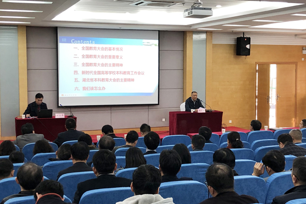 学习全国教育大会精神中,校长董仕节,副校长何慧刚、陈向军分别作主题发言。董仕节介绍了全国教育大会的基本情况、大会召开的重要意义与主要精神,重点谈了学校在新时代教育发展大势中怎么办。何慧刚重点指出我校本科教育取得的成绩与存在的不足,并提出了落实精神的六大具体举措以及五大保障机制。陈向军着重分析了我校科研工作现状与存在的主要问题,指出了我校科研工作面临的严峻挑战,提出做好当前科研工作的五点意见。