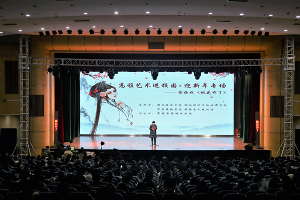 本网讯(见习记者 杨秋凤 杜天豪 彭照凡 摄影 曾慧 曾权 庞苏皖 赵智威 黄书琪)12月20日晚,黄梅戏剧院带来的高雅艺术进校园·迎新年专场——黄梅戏《桃花开了》走进我校。该活动由中共黄梅县委、黄梅县人民政府、湖北经济学院、湖北经济学院法商学院共同主办。1500余名师生齐聚一报,共享视听盛宴。