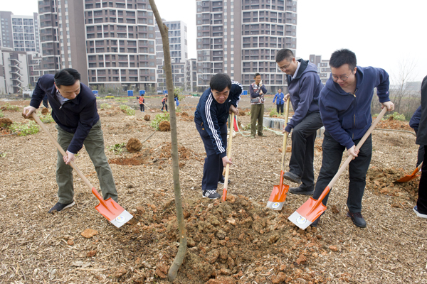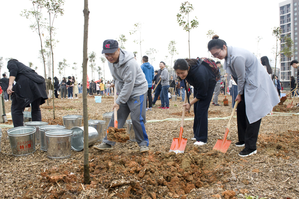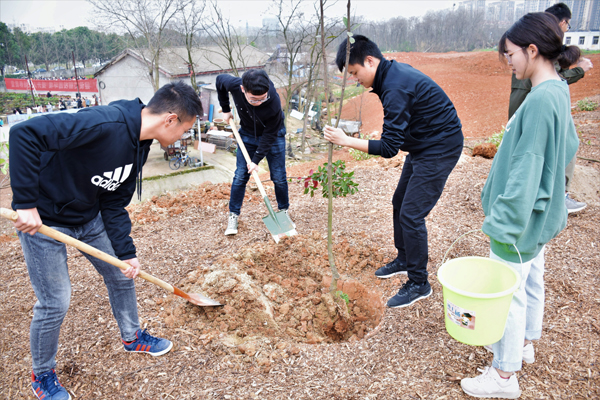 校党委书记温兴生宣布植树活动开幕。各学院师生代表、机关工会教职工代表、校友代表以及招商银行武汉分行新入职员工共栽种350棵红叶石楠树。