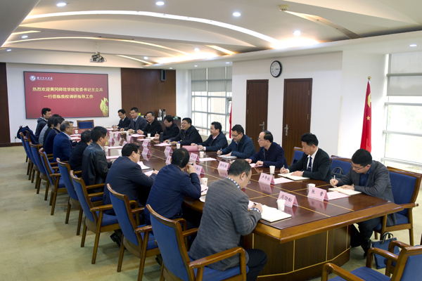 本网讯(记者 刘越 见习记者 谈姗姗 摄影 陶慧)3月21日,黄冈师范学院党委书记王立兵、校长陈向军、党委常委王锋一行来校调研。校党委书记温兴生会见王立兵一行,副校长吴显富出席座谈会。学校办公室、组织部、人事处、科研处、资产与设备管理处、后勤集团、审计处负责人参加。